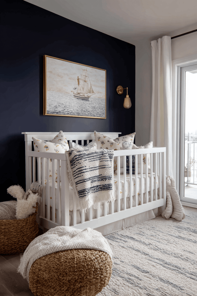 The foundation of a nautical nursery is often a crisp navy-and-white color scheme. This timeless pairing instantly sets a maritime tone while keeping the room fresh and calming. Paint one accent wall navy and leave the rest white for balance, or use navy crib bedding with white furniture for contrast. Adding pops of red, gold, or rope-textured accessories gives the design an authentic sailor’s touch. This classic look is easy to update as your child grows, transitioning seamlessly from baby to toddler years.