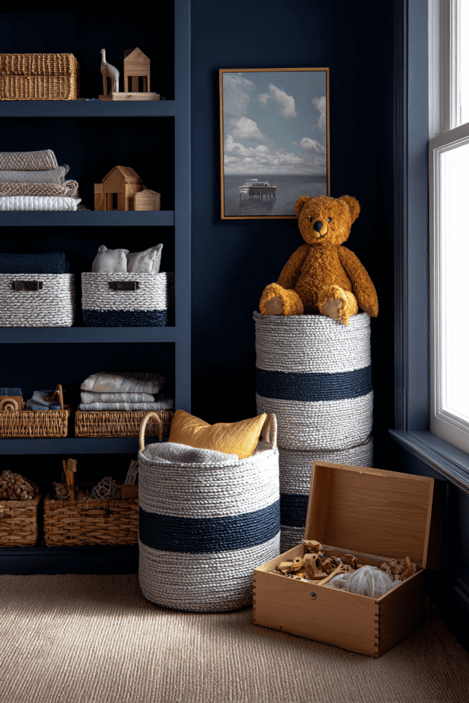 Stylish storage keeps the nursery organized while complementing the theme. Use woven baskets in navy and white, wooden chests with anchor motifs, or canvas bins with rope handles. These pieces add visual interest while serving a practical purpose, making it easy to keep the room tidy.