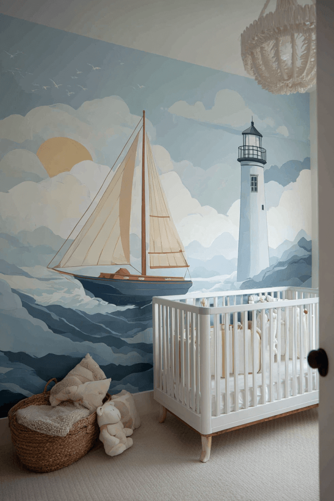 Large-scale wall murals can instantly transform a nursery into a coastal retreat. Popular choices include lighthouses, sailboats, rolling waves, or whimsical under-the-sea scenes. For flexibility, consider peel-and-stick murals that can be removed or updated as your child grows. These visuals create an immersive environment, making the nursery feel like an ocean adventure every time you walk in.