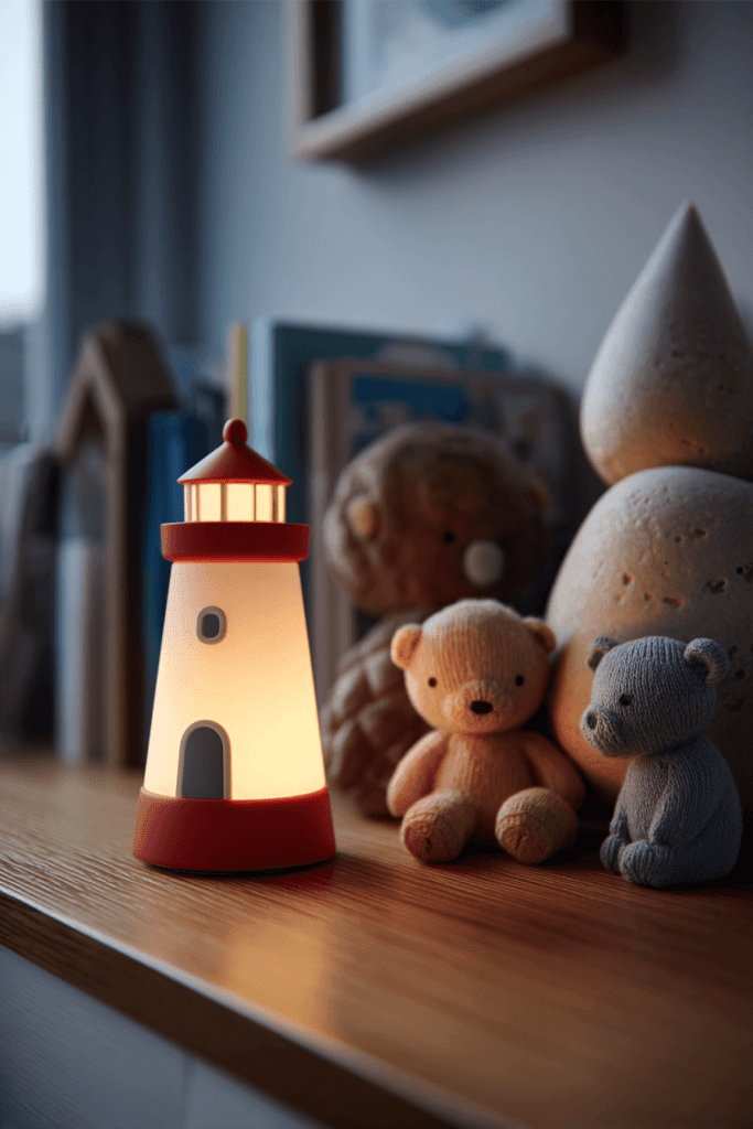 A lighthouse-shaped night light is both decorative and functional. It softly illuminates the nursery during nighttime feedings, adding a charming maritime touch. Pair it with other lighthouse motifs on the walls or shelves for a coordinated look that ties the theme together.