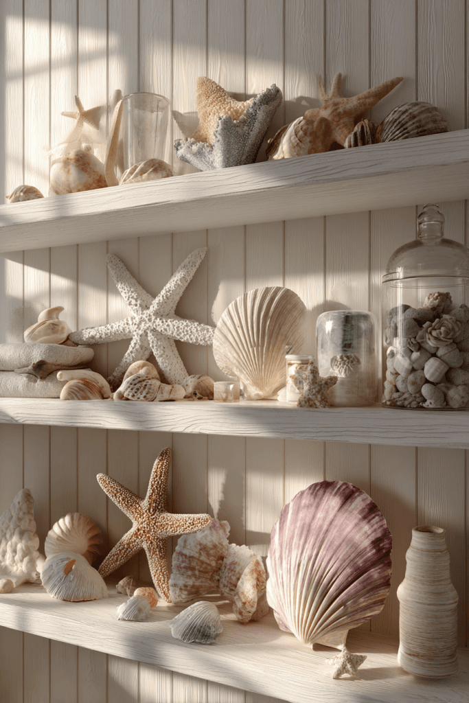 Incorporating seashells, starfish, and other coastal finds adds texture and a natural beach vibe. Display them in glass jars, shadow boxes, or on floating shelves for a subtle nod to the seaside. They pair beautifully with light wood tones and soft fabrics, keeping the space cozy and organic.