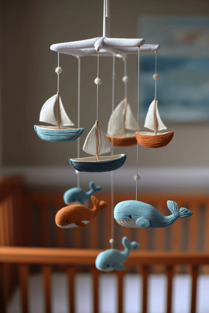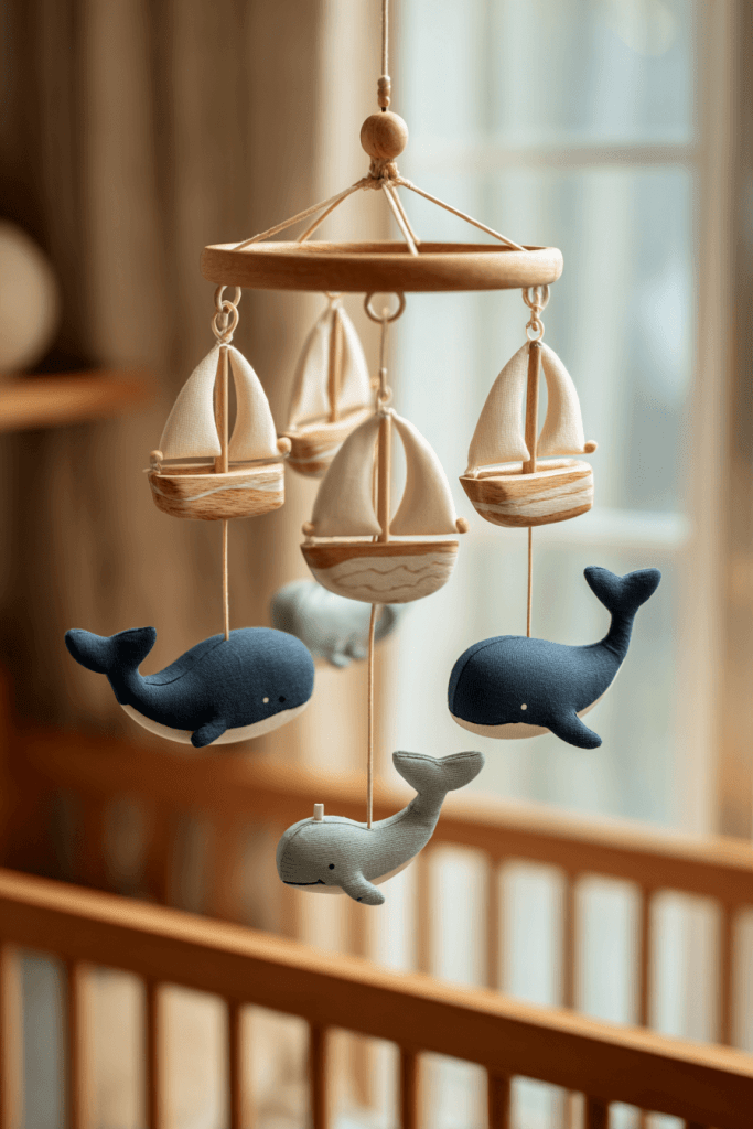 A crib mobile featuring sailboats, whales, or anchors provides both entertainment and thematic consistency. Choose muted colors for a calming effect, or brighter tones for a playful twist. The gentle movement of the mobile helps stimulate your baby’s visual development while fitting perfectly into the nautical style.