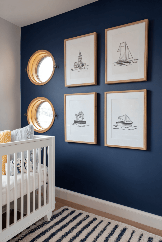 Round frames designed to look like ship portholes can display baby photos, artwork, or nautical prints. This small detail instantly enhances the theme while offering a unique way to personalize the space. Group several porthole frames together for a striking gallery wall.
