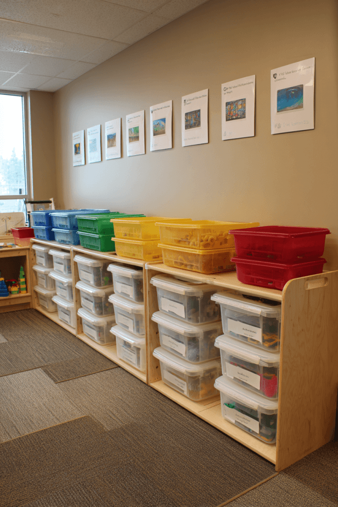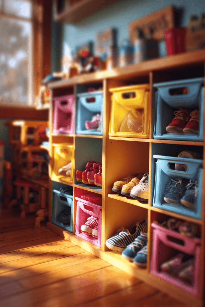 Colorful cubby shelves and bins are a parent’s best friend. Assign each child a cubby for shoes, backpacks, and personal items, then use labeled bins for toys or art supplies. Clear bins let kids see what’s inside, making it easier for them to clean up on their own.