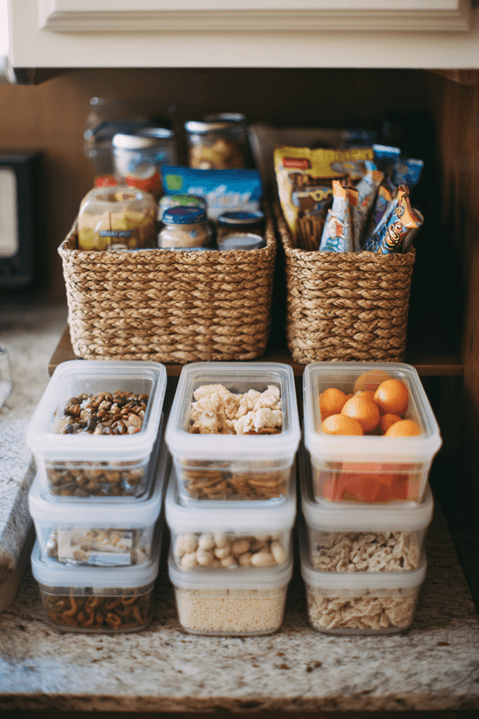 Set up a low pantry shelf or basket with healthy snacks that kids can reach themselves. Use clear bins for granola bars, fruit cups, or crackers.
