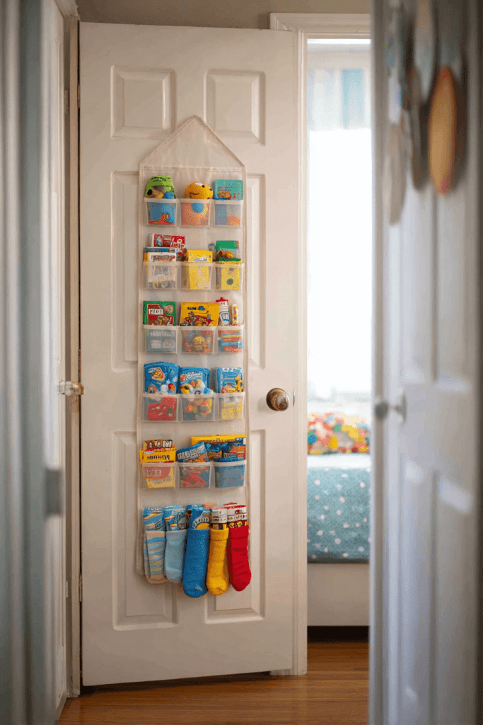 An over-the-door shoe organizer isn’t just for shoes! Hang one on a closet or bedroom door and fill the pockets with small toys, art supplies, socks, or accessories.