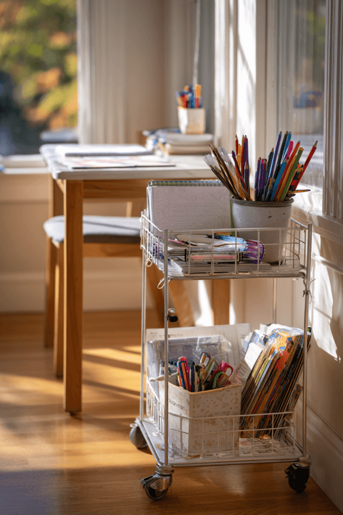 Create a homework-friendly zone with portable caddies, supply carts, or wall-mounted organizers. Stock it with pencils, scissors, glue sticks, and paper.