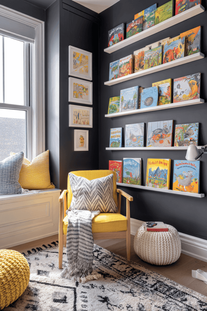 Encourage reading (and keep books tidy) with shallow wall-mounted shelves or ledges at kid height.
