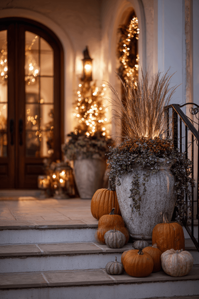 Frame your entryway with urns or large planters filled with stacked or clustered pumpkins. Add trailing ivy, pampas grass, or autumn branches for extra drama and texture.