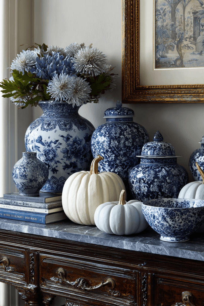 Mix pumpkins with classic blue and white porcelain pieces for an unexpected, high-end twist. Arrange pumpkins inside ginger jars, or cluster them on a shelf alongside your favorite china.