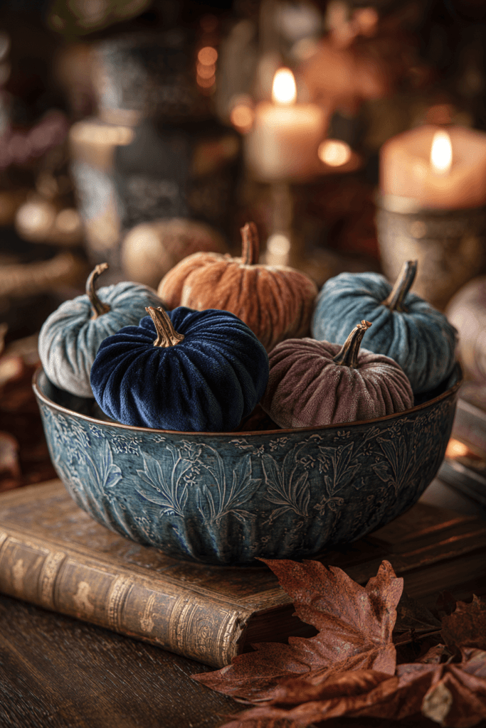Velvet pumpkins add texture and a plush, cozy vibe that’s undeniably elegant. Opt for shades like deep emerald, sapphire, or blush to complement your autumn palette.