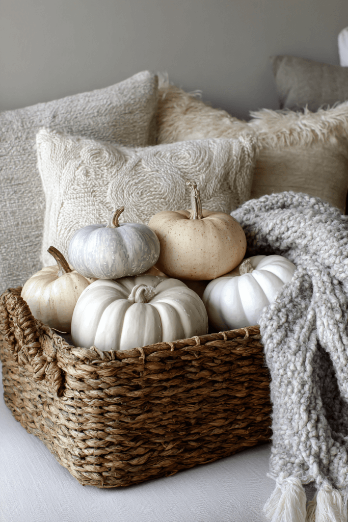 For a subtle and sophisticated effect, paint pumpkins in muted shades like taupe, dove gray, or soft blush. Arrange them in woven baskets, on window sills, or among neutral décor.