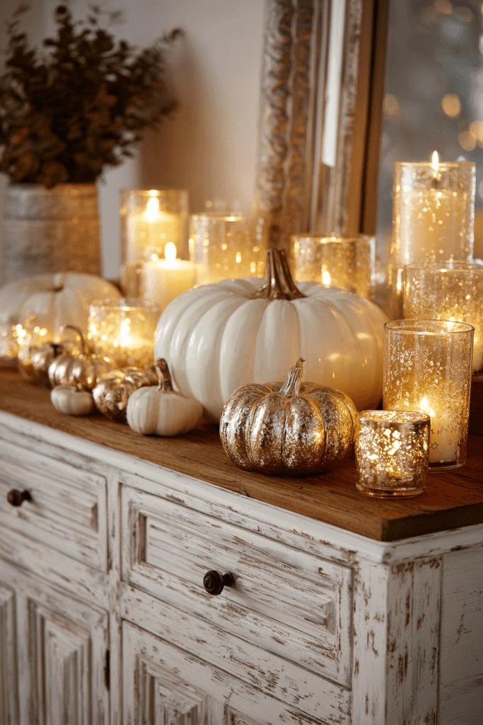 For added sophistication, mix in candlesticks, greenery, or metallic accessories. The simplicity of white pumpkins allows other elements to shine, creating a serene and upscale vibe.