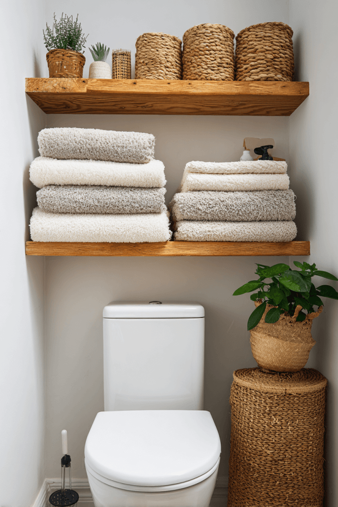 Use simple wooden planks, brackets, or even repurposed ladders to create extra storage for towels, baskets, and decorative accents.